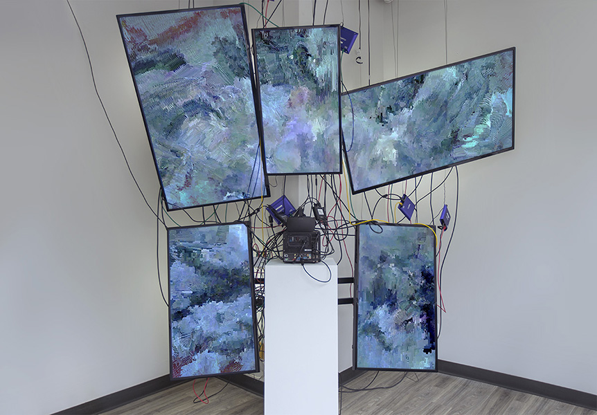 «Nature Morte» is a project which aims at questioning our relationships with screens and the virtual world. The sculpture serves as a portal which allows the spectator to cross from one world to another through a game of perspectives. Nature Morte is a contemporaneous appropriation of the art style which bears the same name. Screens are arranged in such a way as to symbolize their obsolescence in the near-future, when they will be replaced by the immaterial. The project is focused on the materiality of this technology which is dedicated to the access to the virtual. Created entirely from consumer tech, «Nature Morte» expose the hidden potential of a technology which is often trivialized due to its omnipresence. The retro-futurist aesthetic also presents an opportunity to exaggerate the volume of space this technology takes in the physical world in order to comment on its increasing presence in our daily lives. Baron Lanteigne will be making the trip from Canada in order to set up his installation in situ.
