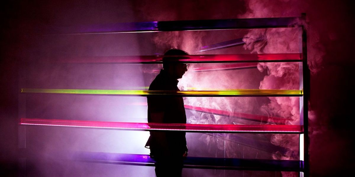 Born from a fascination between science, sound and light, the «frequencies» project led Nicolas Bernier to interest himself with the quantum – the smallest unit of energy. The artist explores the conceptual relationships between quantum physics principles and audio luminescent art: particles, probabilities, duality wave/corpuscle and discontinuity. The composition, metaphorically structured around these principles, articulates in real time one hundred audio-visual fragments in a random spatio-temporal efflorescence, building itself continuously before our eyes. The signs, lines and dots engraved on its panels come to life when exposed to light, constantly creating new visual compositions through reflections. The device thereby proposes a singular three-dimensional vision in space.